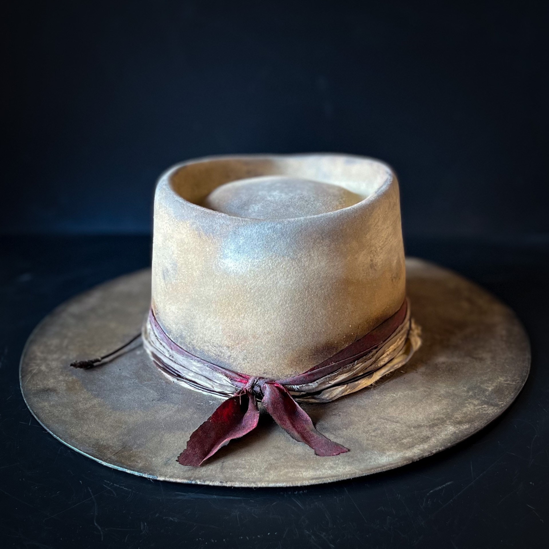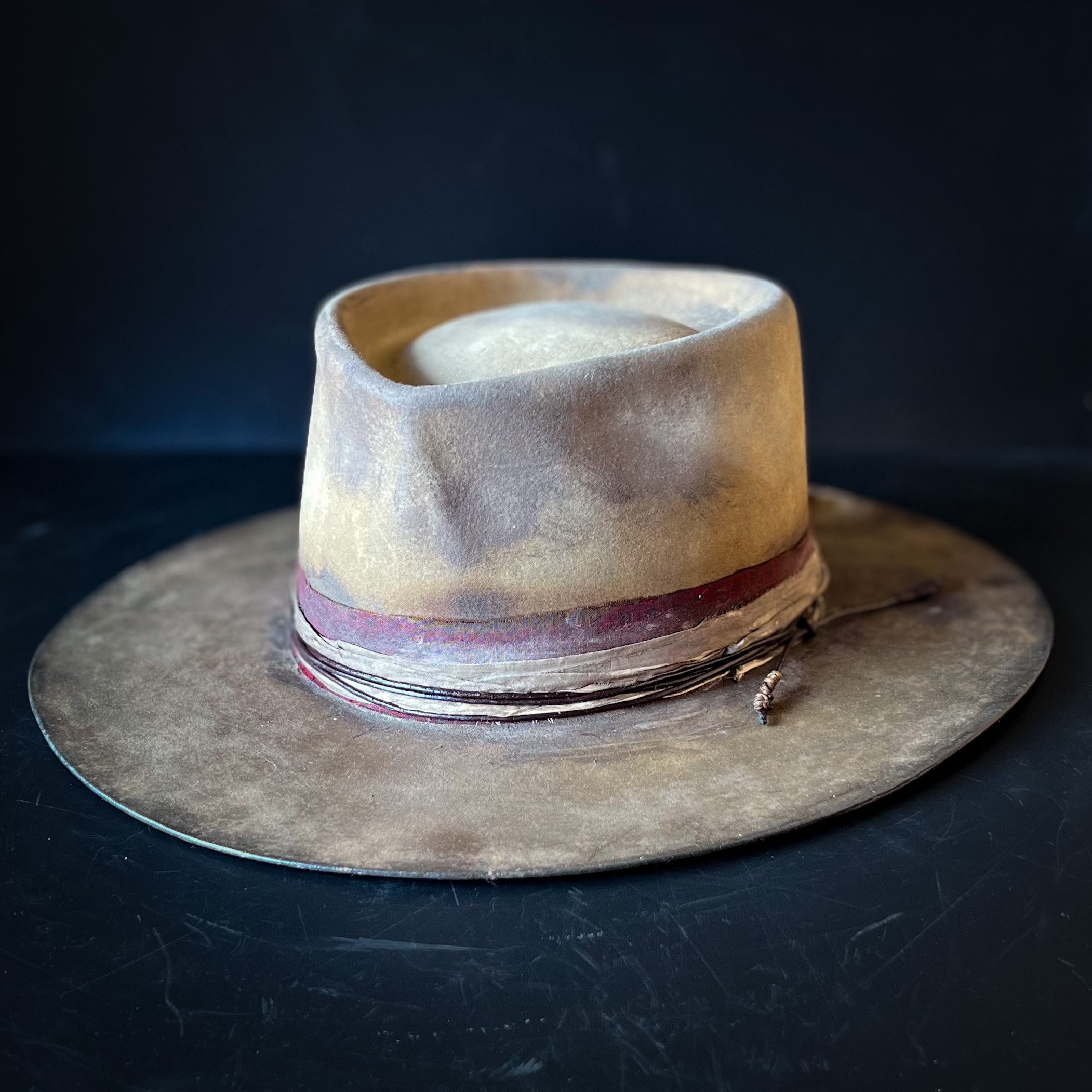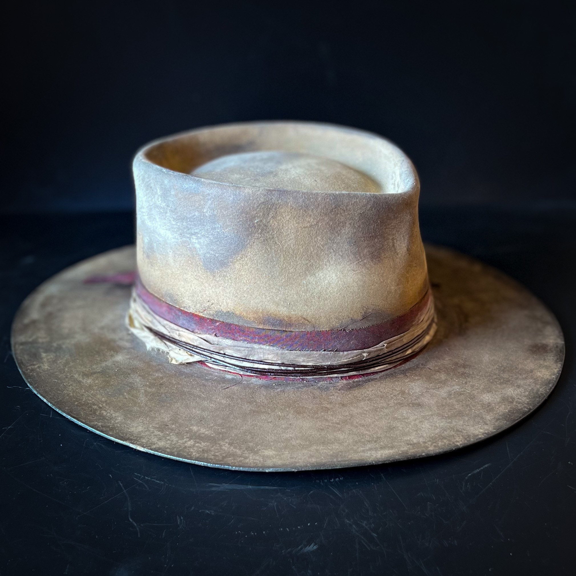 Soiled red cotton ribbon wraps around the crown followed by a dirty silk wrap. Leather cord wraps around and ties off in the side. The inside has a soft leather sweatband and a satin liner. This hat will give you character for sure. Turn heads in the “No Good” from Geniushatter.