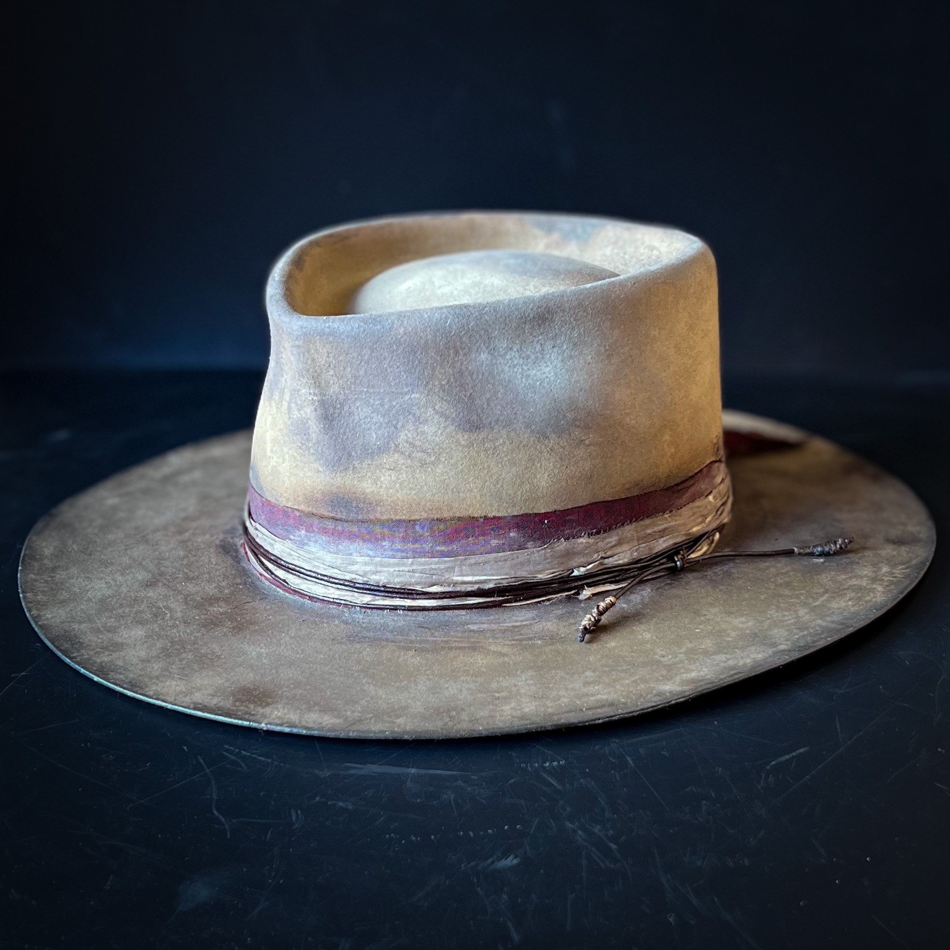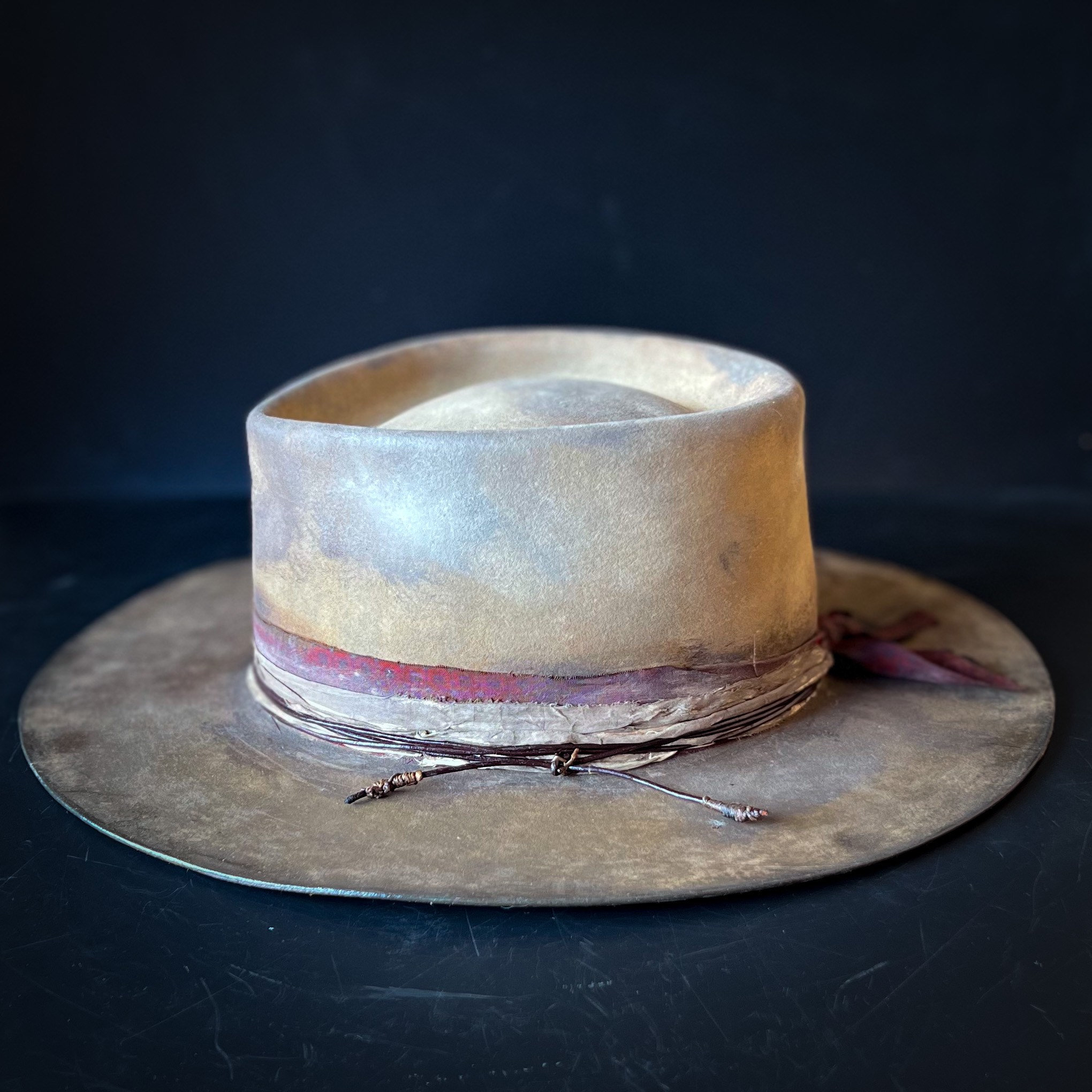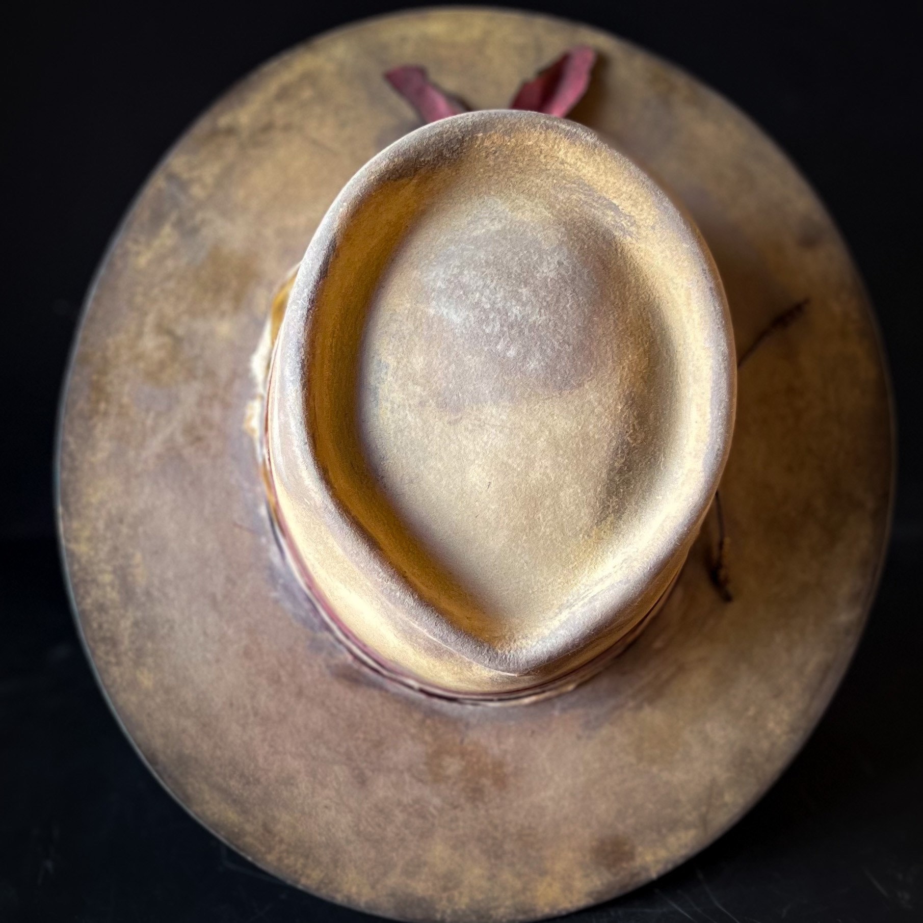 Soiled red cotton ribbon wraps around the crown followed by a dirty silk wrap. Leather cord wraps around and ties off in the side. The inside has a soft leather sweatband and a satin liner. This hat will give you character for sure. Turn heads in the “No Good” from Geniushatter.