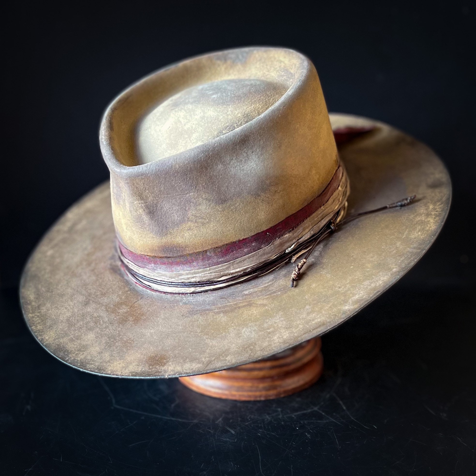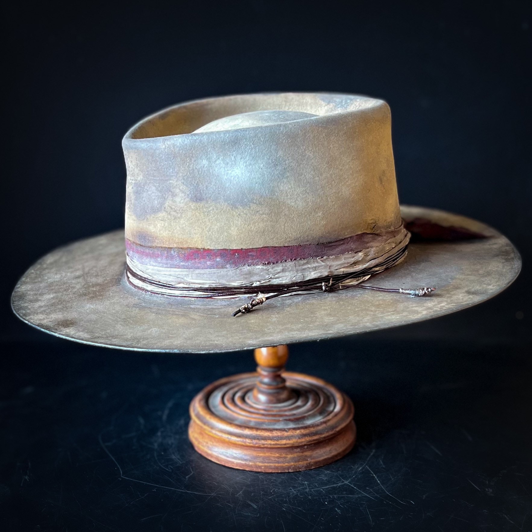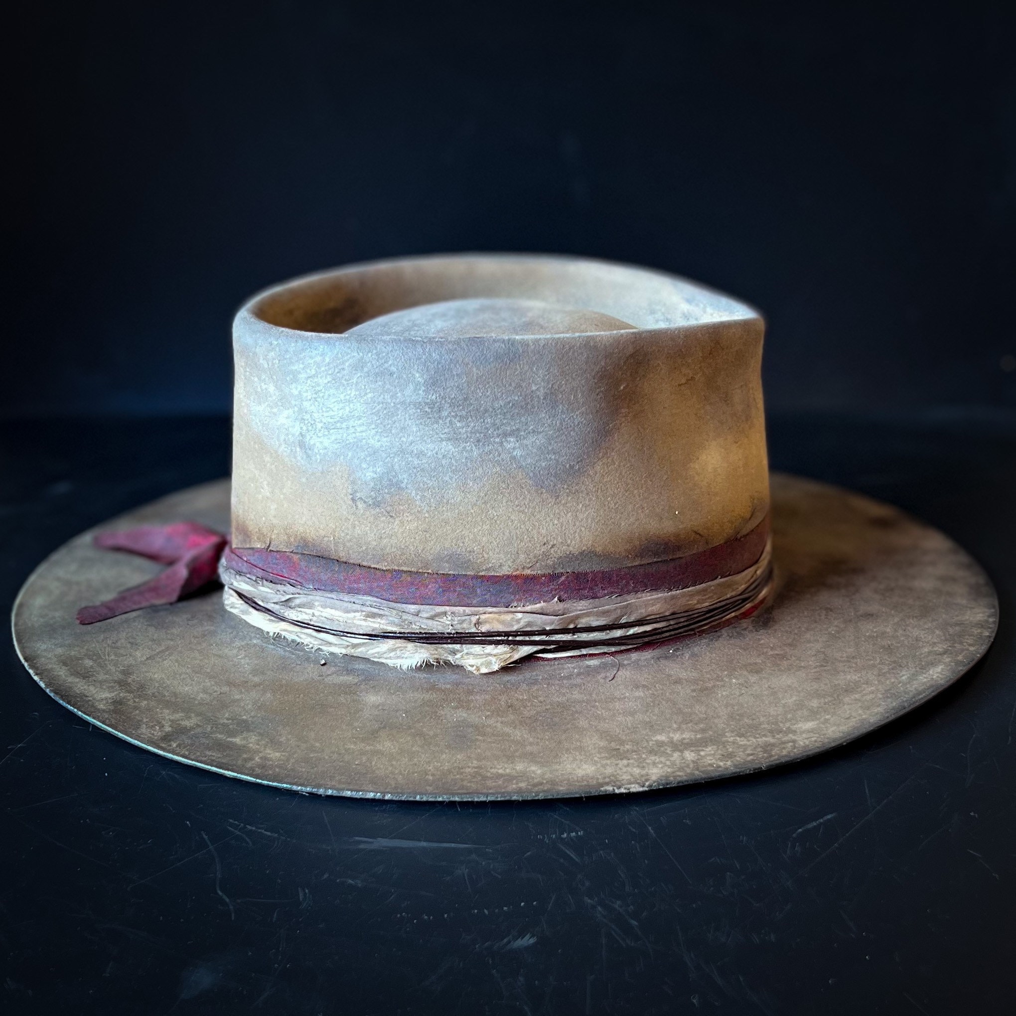 The “No Good” from Geniushatter is a size 7 3/8, 100X Beaver. Heavily distressed to look worn. 4 inches high crown with a 3 1/2 inches wide brim. Originally a gray color but distressed and soiled to give it its outlaw appearance. Not stiff at all, brim has a lot of give and will likely take on a mind of its own when worn. Can easily be manipulated and bent if needed.