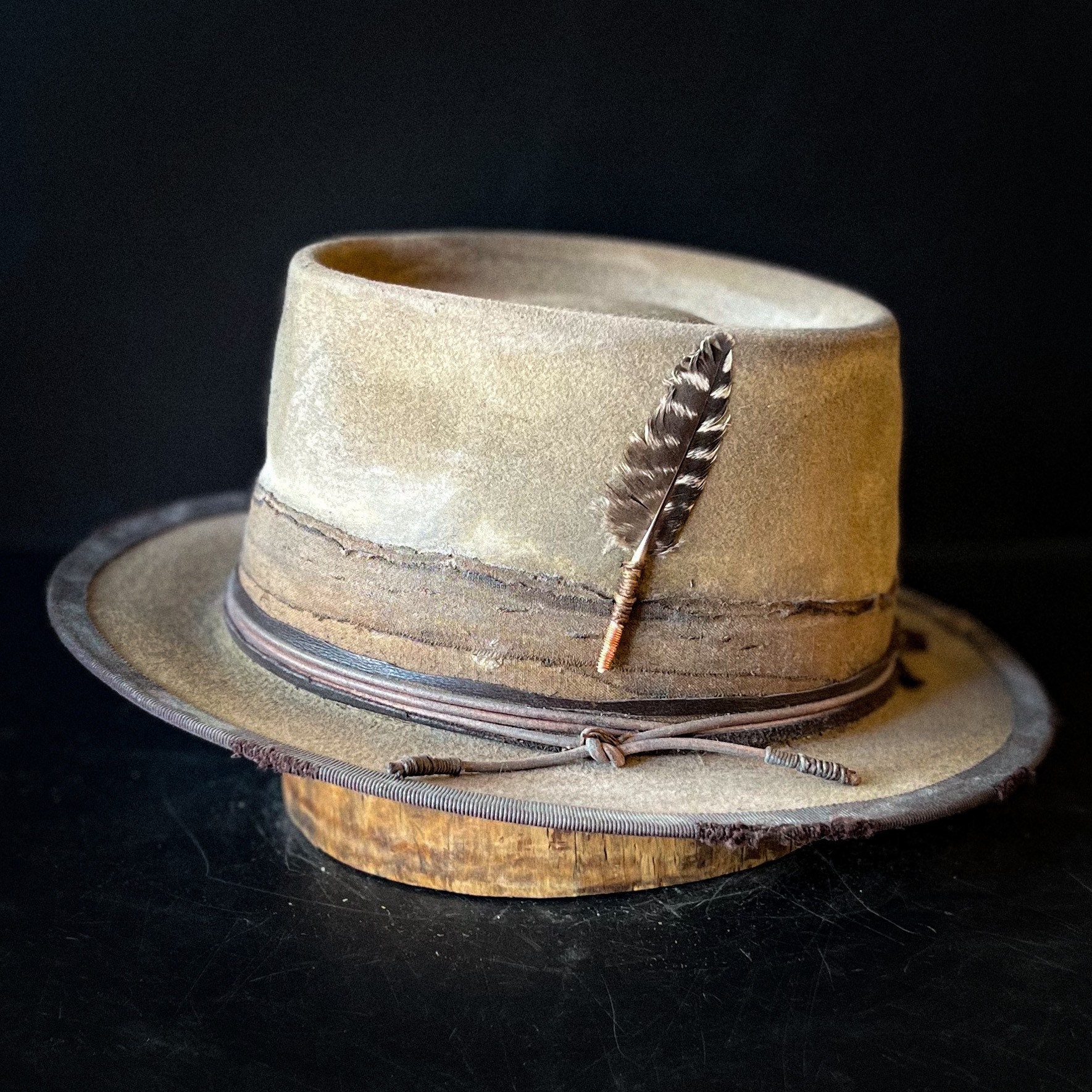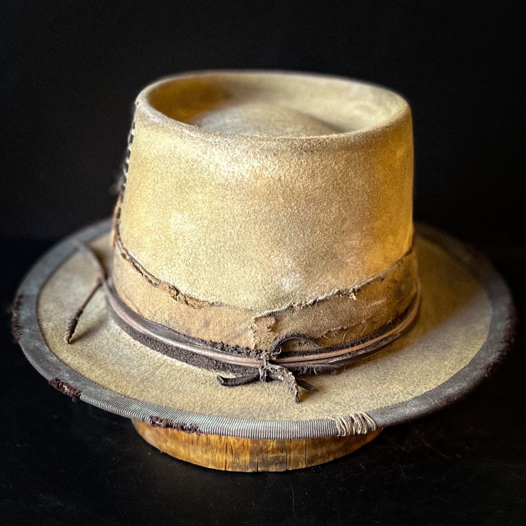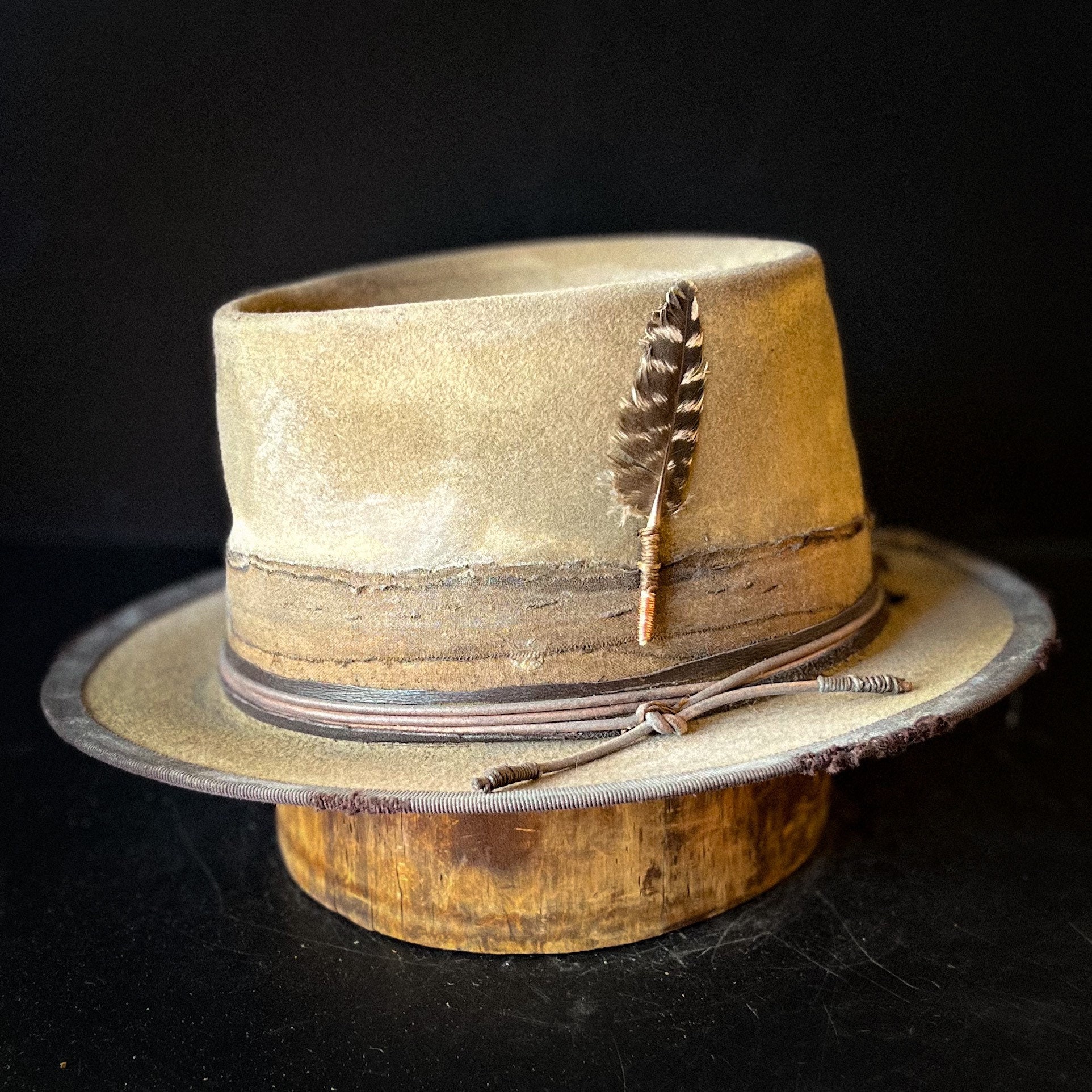 Heavily distressed hat with a two inch brim and 5 inch crown. 100% Beaver fur, western weight at 165g. Layered with distressed, tattered fabric as a band, then leather cord and leather strips. A small feather adorns the side.