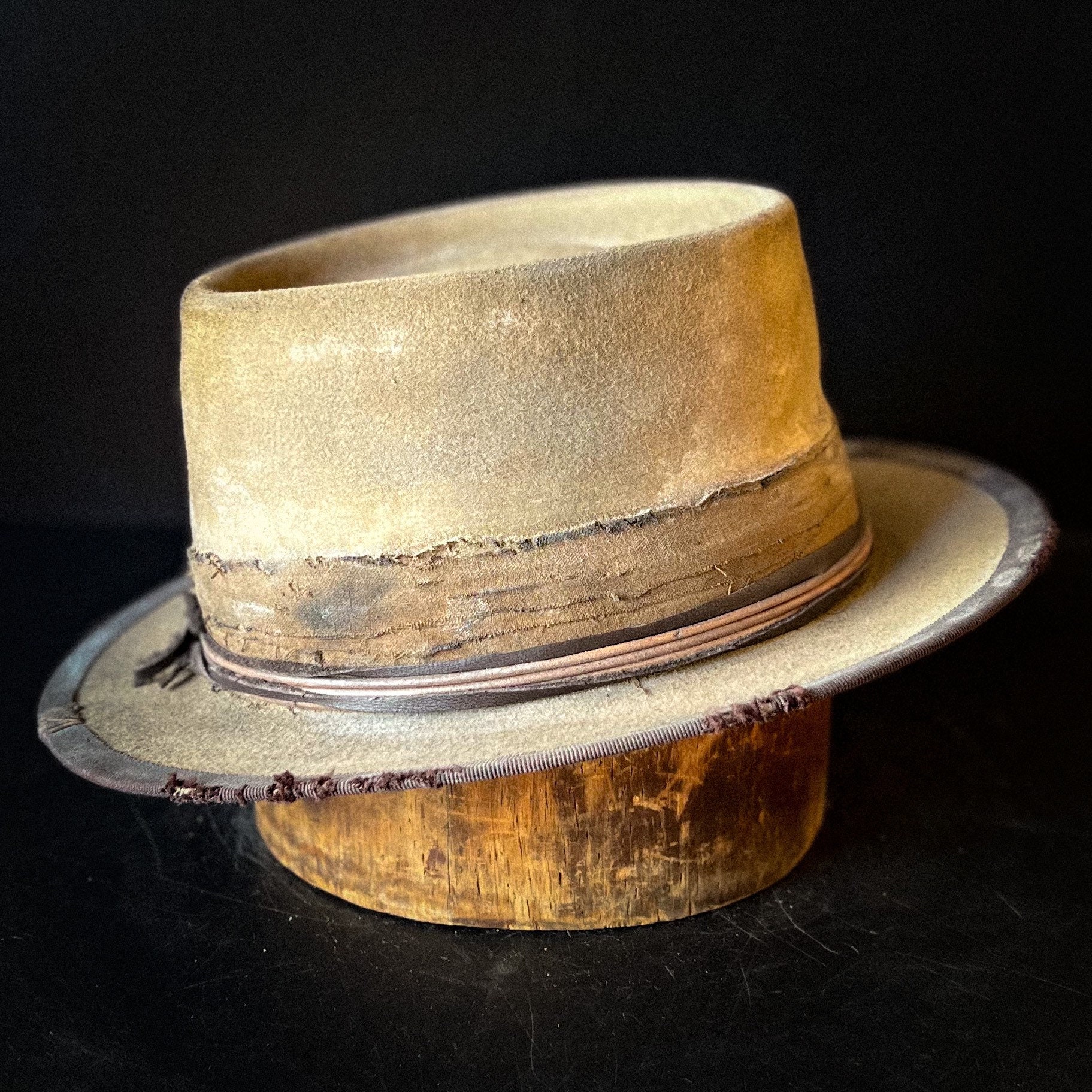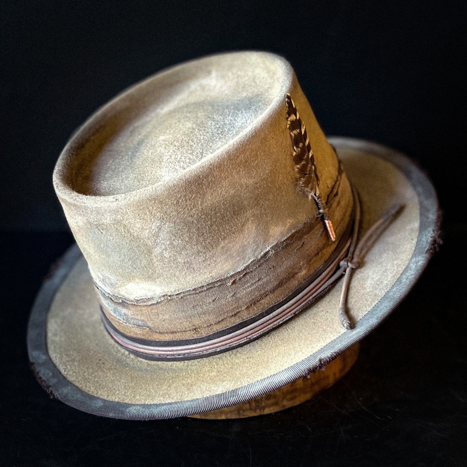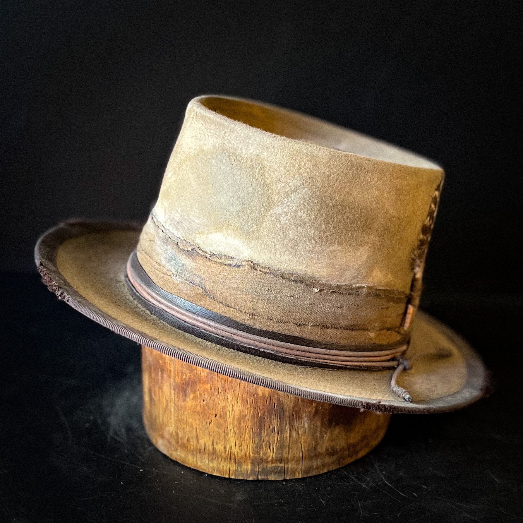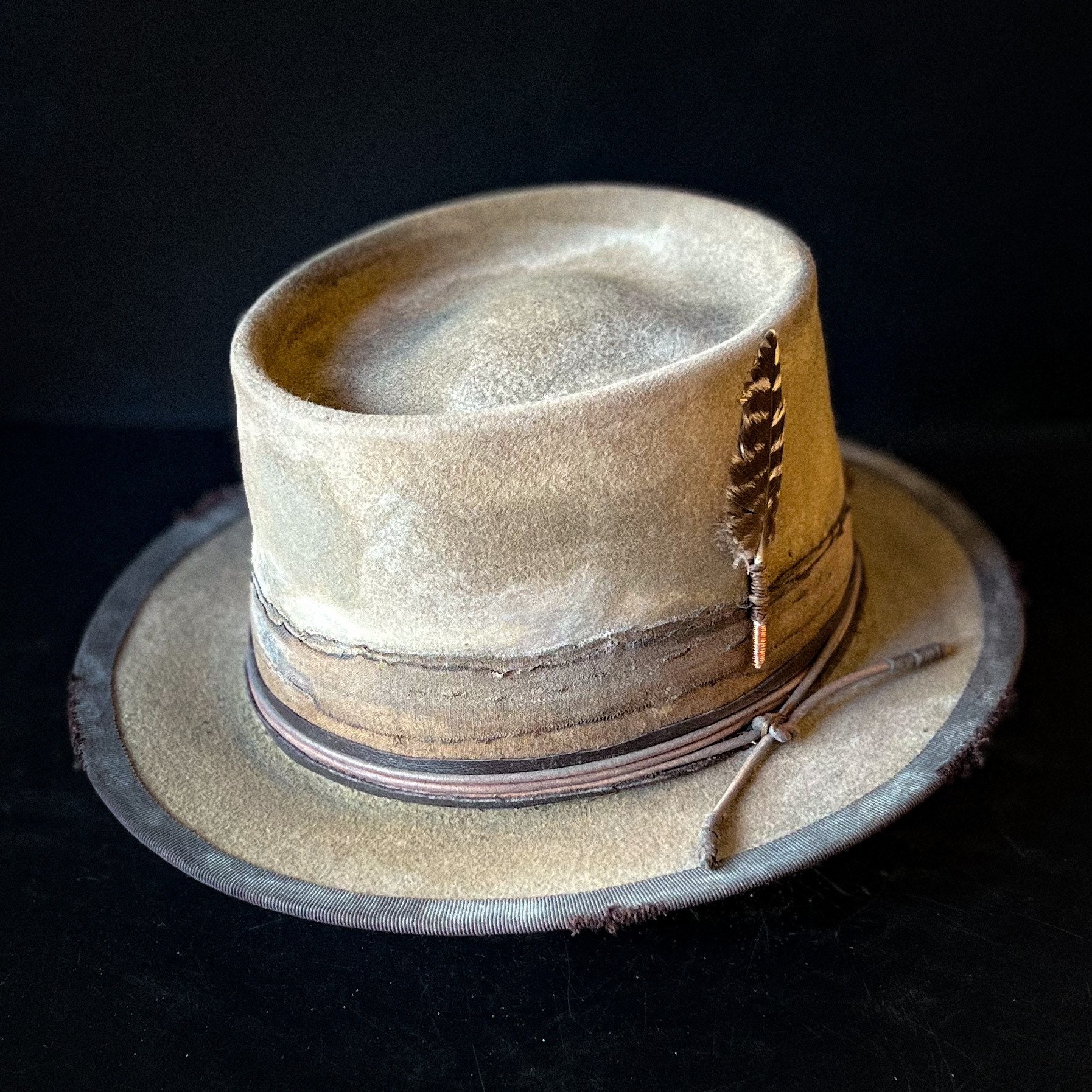 Heavily distressed hat with a two inch brim and 5 inch crown. 100% Beaver fur, western weight at 165g. Layered with distressed, tattered fabric as a band, then leather cord and leather strips. A small feather adorns the side.